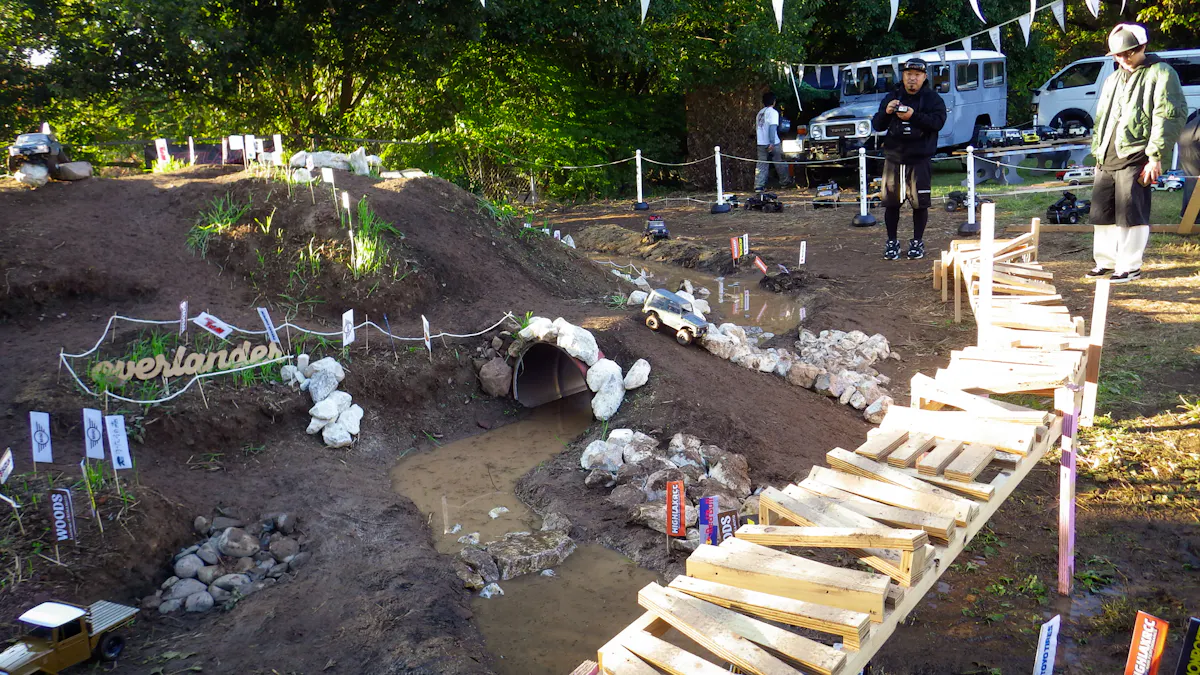 オフロードなコースが再現されており、ラジコンが縦横無尽に走っている。